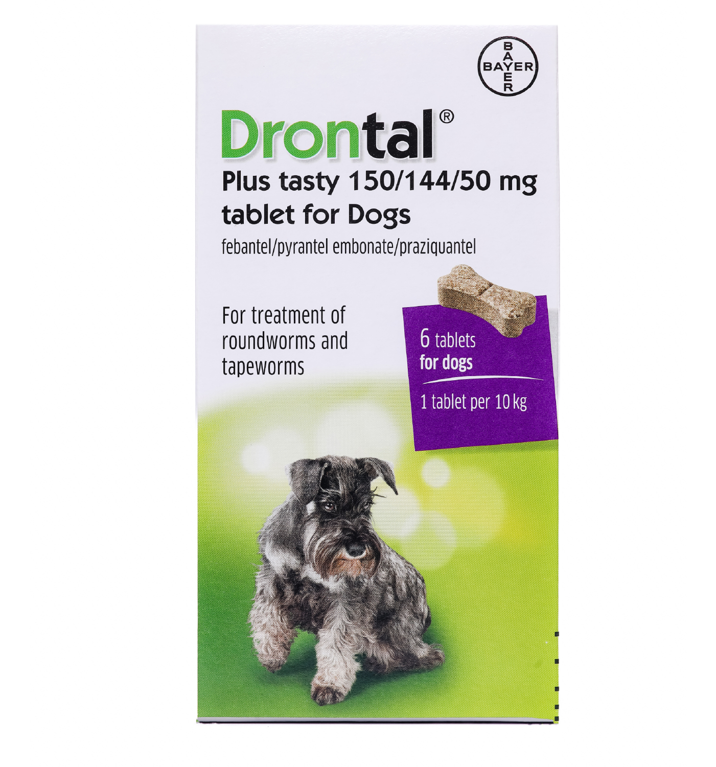 Uses: Drontal® Plus (praziquantel/pyrantel pamoate/febantel) Taste Tabs® Broad Spectrum Chewable Anthelmintic Tablets are indicated for removal of Tapeworms (Dipylidium caninum, Taenia pisiformis, Echinococcus granulosus, and removal and control of Echinococcus multilocularis) and for removal of Hookworms (Ancylostoma caninum, Uncinaria stenocephala), Ascarids (Toxocara canis, Toxascaris leonina), and Whipworms (Trichuris vulpis) in dogs.