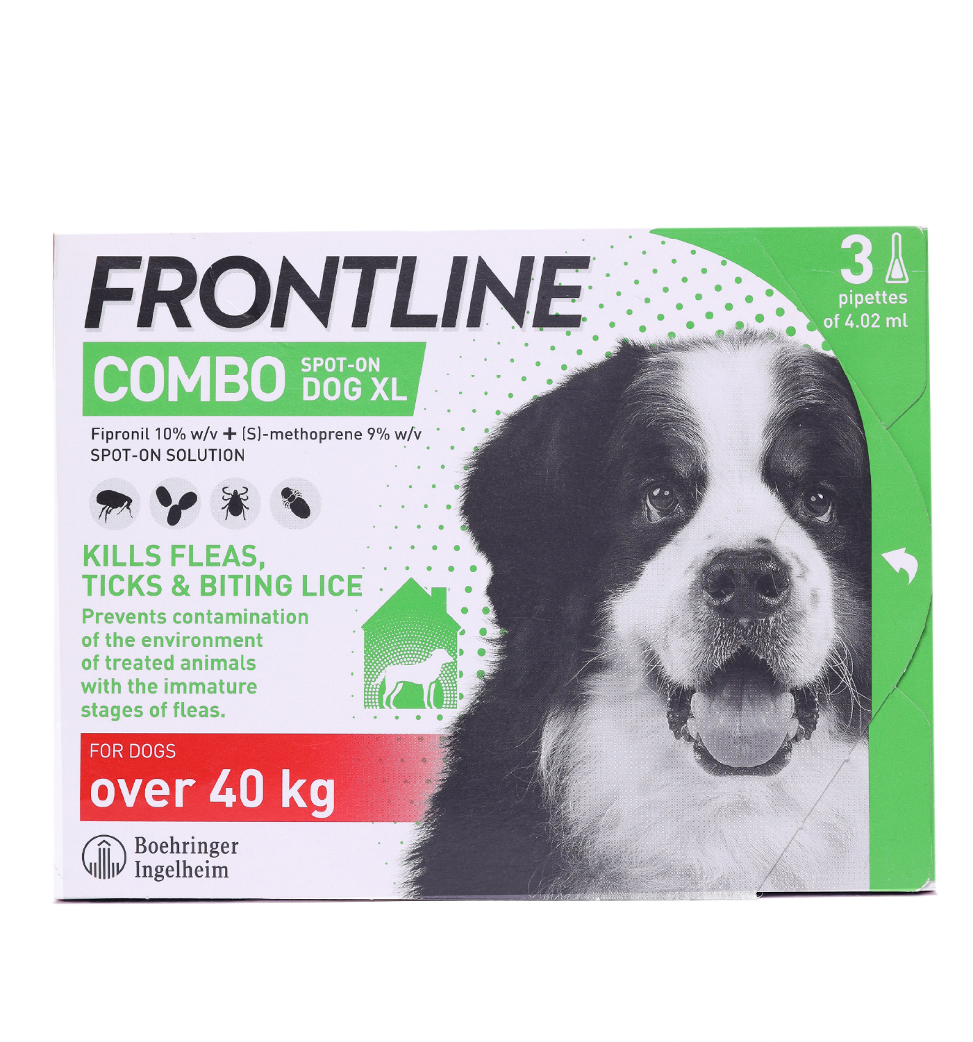 Composition and description: Dual-action formula: fipronil + (S)-methoprene. Stops flea lifecycle. Monthly use.
